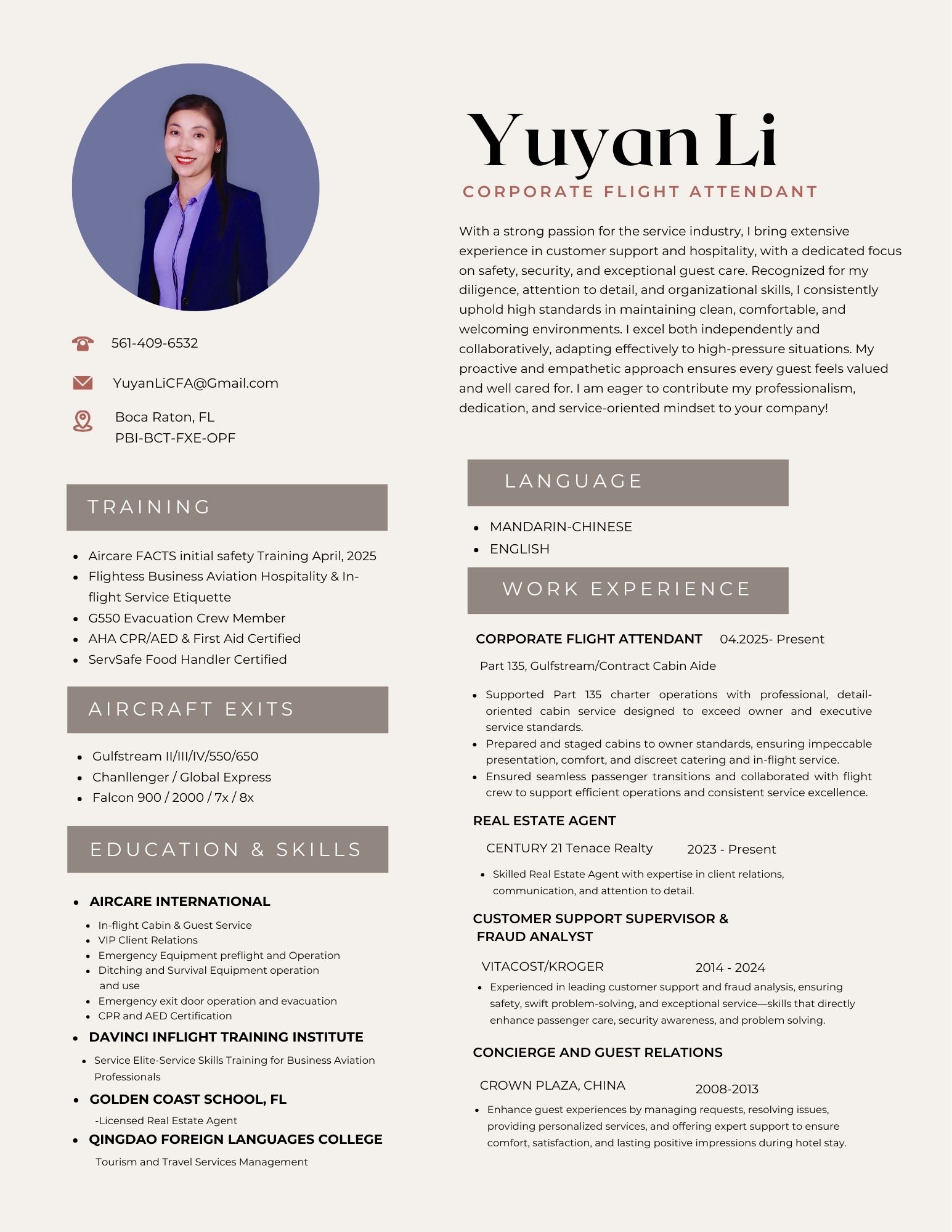 I’m Yuyan Li, a dedicated Corporate Flight Attendant with a strong passion for the service industry, specializing in safety, security, and exceptional guest care. Based in South Florida, PBI-BCT-FXE-OPF, seeking full and part time opportunities worldwide and ASAP trips. I bring over 15 years of experience in hospitality, customer support, and client relations, ensuring high standards of comfort and satisfaction in dynamic environments. My professional training includes Aircare FACTS Initial Safety Training (completed April 2025), Flightess Business Aviation Hospitality & In-Flight Service Etiquette, Davinci Inflight Elite Service Training, G550 Evacuation Crew Member certification, AHA CPR/AED & First Aid, and ServSafe Food Handler certified. I’m proficient in operating emergency equipment, ditching and survival gear, and emergency exits on aircraft such as Gulfstream II/III/IV/550/650, Challenger/Global Express, and Falcon 900/2000/7X/8X. I’m bilingual in Mandarin-Chinese and English, enhancing my ability to serve diverse VIP clients. In my career, I’ve excelled as honing skills in client relations, communication, and attention to detail. I led teams in swift problem-solving, security awareness, and exceptional service. I managed concierge and guest relations, resolving issues and delivering personalized experiences to ensure lasting positive impressions. Driven by a proactive, empathetic approach, I thrive in high-pressure situations, working independently or collaboratively to create welcoming environments. I’m eager to bring my diligence, organizational expertise, and service-oriented mindset to a forward-thinking aviation team, prioritizing passenger safety and unparalleled care.
