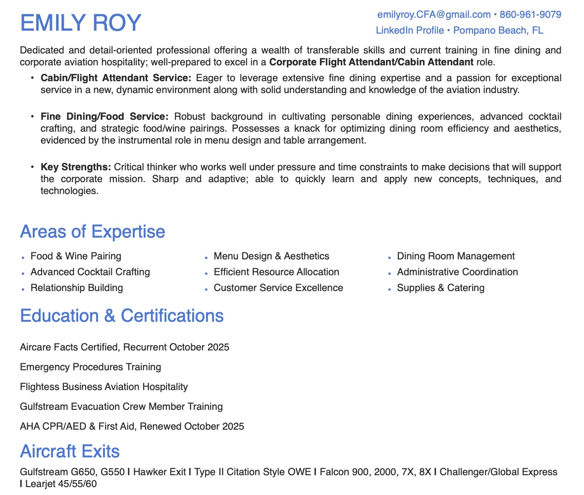 I’m a certified corporate flight attendant with a strong foundation in luxury hospitality and over four years of fine dining experience. I’ve trained extensively to provide elevated service in the air, and I bring a deep understanding of discretion, attention to detail, and anticipating guest needs. I’m passionate about creating seamless, memorable experiences—whether that means delivering personalized onboard service, adapting quickly to last-minute changes, or maintaining calm professionalism under pressure. Originally from Connecticut, I relocated to South Florida independently, which has helped me build resilience, adaptability, and confidence in new environments. I take pride in showing up prepared, polished, and positive. I’m seeking contract opportunities where I can contribute my hospitality expertise, strong work ethic, and love for travel to serve high-profile clients with excellence. Feel free to contact me and I will gladly send you any further information you may need.